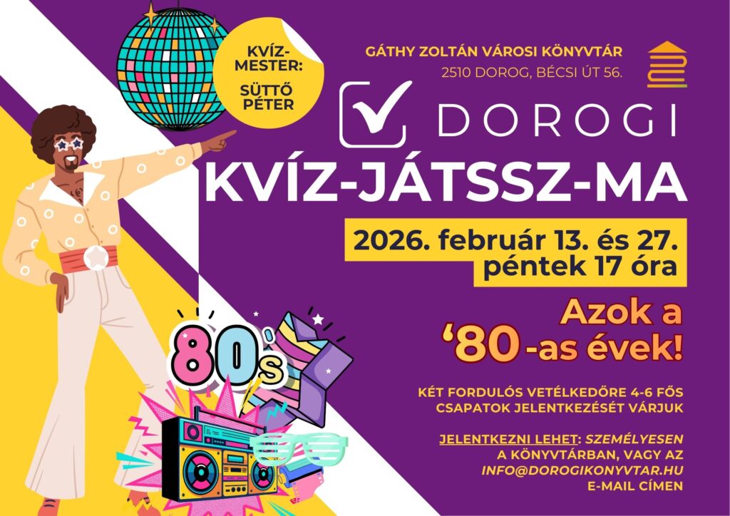 pén27már.17:0019:00Kvíz-Játssz-Ma - Legendás '90-es évek17:00 - 19:00 Gáthy Zoltán Városi Könyvtár